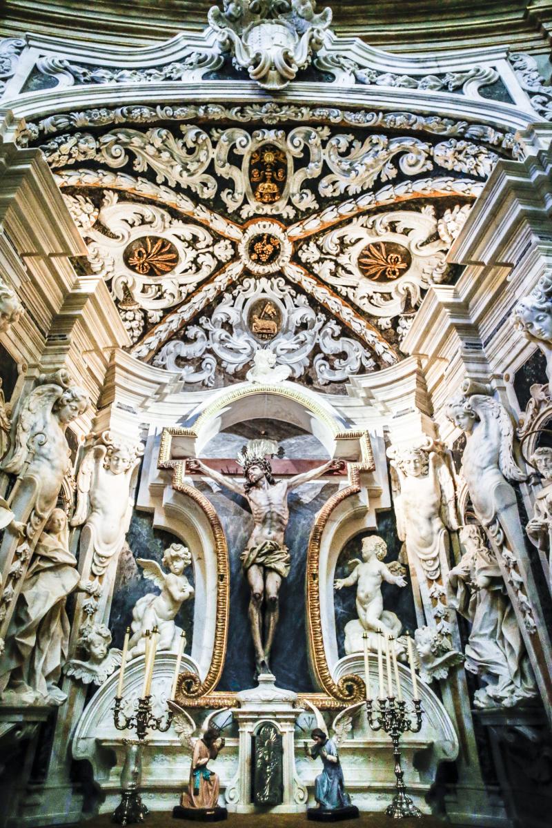 El Oratorio tiene planta elíptica, rodeada por 7 capillas rectangulares con bóvedas de cañón y rica decoración. Destaca especialmente la capilla del Sagrario, con un retablo barroco del siglo XVIII de mármol policromado de origen italiano, presidido por un crucifijo de madera también de origen italiano.