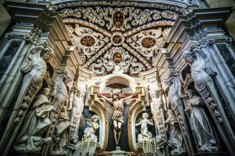 El Oratorio tiene planta elíptica, rodeada por 7 capillas rectangulares con bóvedas de cañón y rica decoración. Destaca especialmente la capilla del Sagrario, con un retablo barroco del siglo XVIII de mármol policromado de origen italiano, presidido por un crucifijo de madera también de origen italiano.